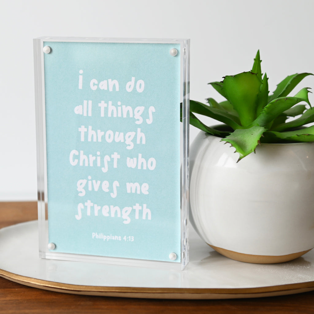 This Philippians 4:13 Acrylic Block Aqua features the powerful message of relying on the Lord. Made with durable acrylic material, it serves as a daily reminder of faith and strength. Add a touch of inspiration to your home or office with this beautiful piece. Measures 4" x 6".