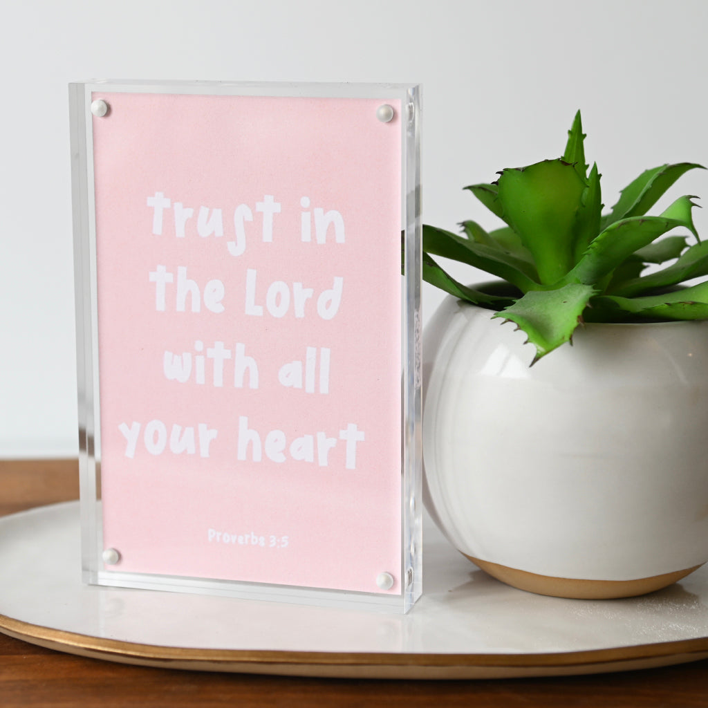 This Proverbs 3:5 Pink Acrylic Block features the powerful message of trusting in the Lord. Made with durable acrylic material, it serves as a daily reminder of faith and strength. Add a touch of inspiration to your home or office with this beautiful piece. Measures 4" x 6".