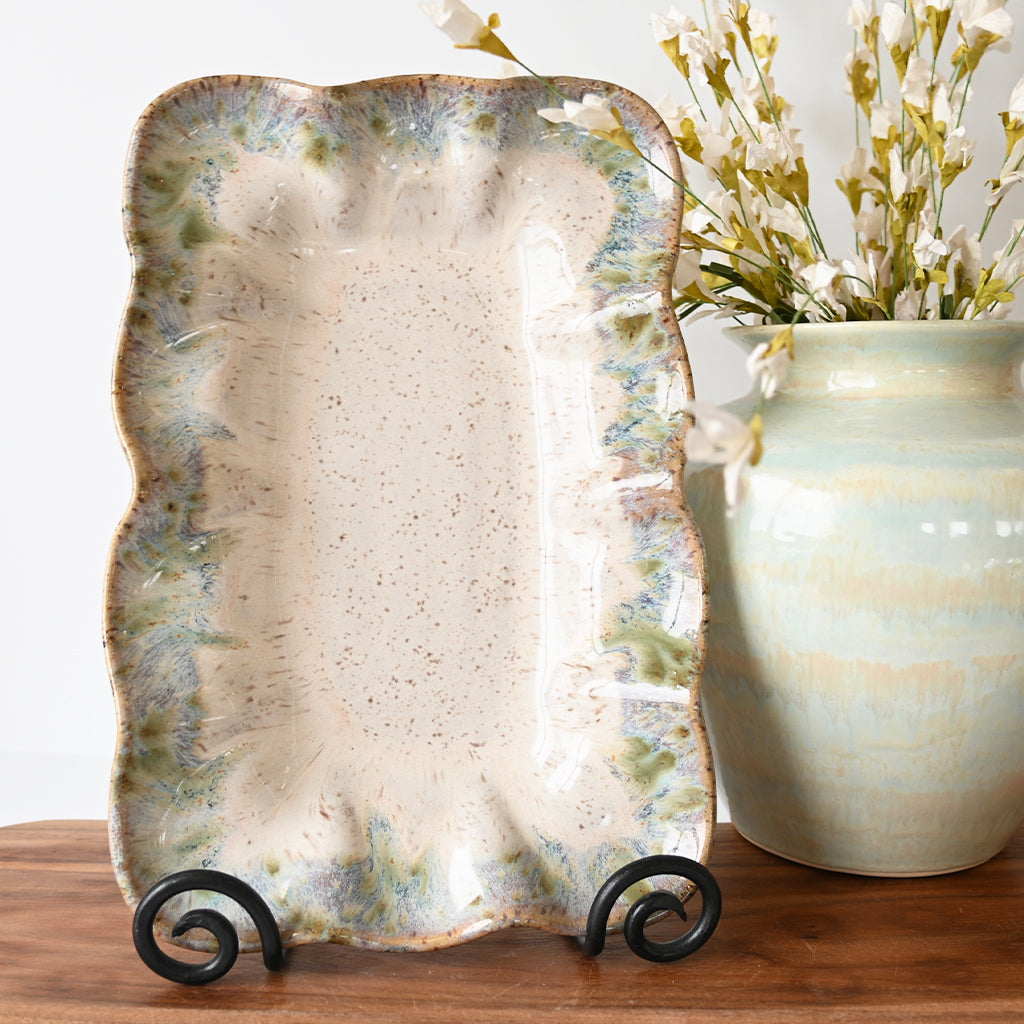 Crafted with a unique ruffled rectangle design, this Botanical dish is not only stylish but also versatile. Use it as a side table, serving piece, or for any other endless possibilities. Elevate your home decor with this beautiful dish.