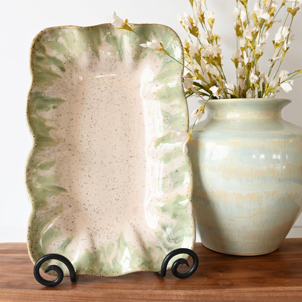 Crafted with a unique ruffled rectangle design, this Matcha dish is not only stylish but also versatile. Use it as a side table, serving piece, or for any other endless possibilities. Elevate your home decor with this Matcha dish.