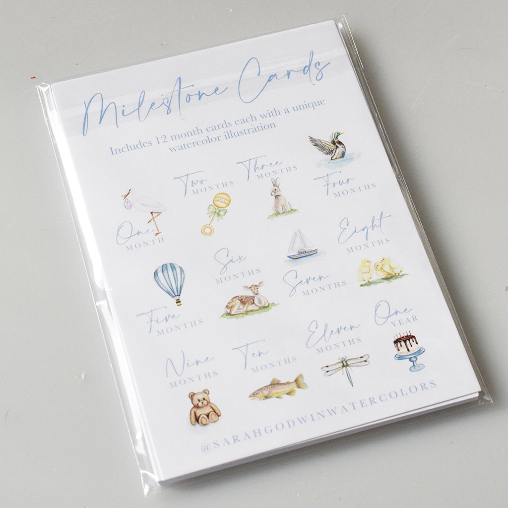 These milestone cards come in packs of 12, with a unique watercolor illustration on each card. Document and celebrate your baby's monthly milestones with these adorable cards!