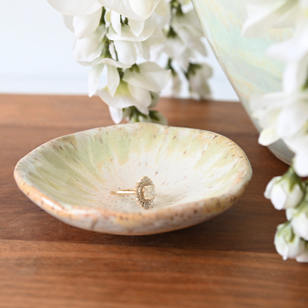 This sauce dish in the Matcha glaze is a beautiful addition to any place setting. Made with creative expertise, the beautiful glaze adds a touch of elegance to your table. Its unique design and glaze make it perfect for serving your favorite sauces, enhancing the dining experience for you and your guests.