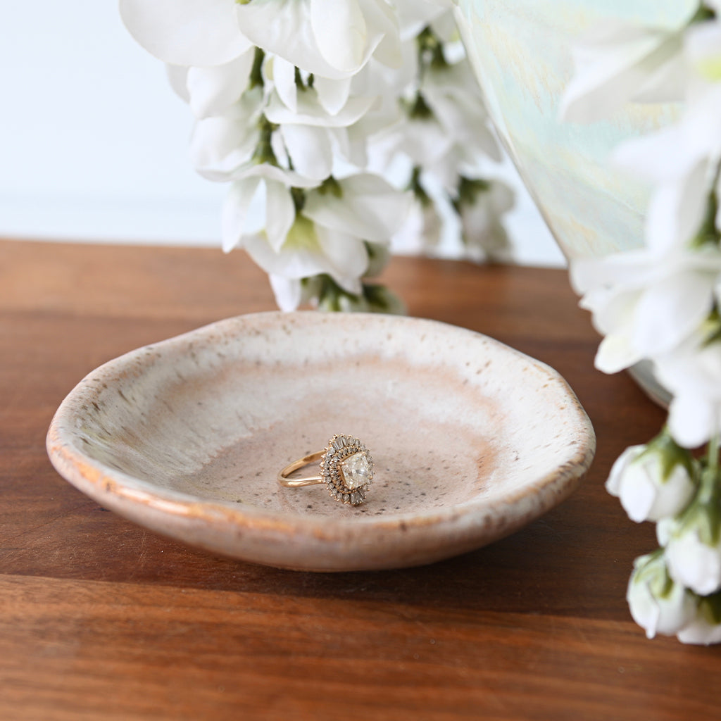 This sauce dish in the Primrose glaze is a beautiful addition to any place setting. Made with creative expertise, the beautiful glaze adds a touch of elegance to your table. Its unique design and glaze make it perfect for serving your favorite sauces, enhancing the dining experience for you and your guests.