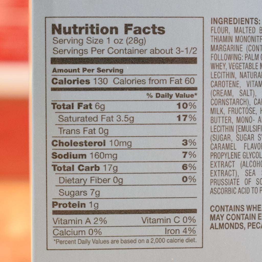 Ingredients: Flour, Margarine, Water, Salt, Natural and Artificial Flavor, Citric Acid, Beta Carotene, Powdered Sugar, Caramel, Sugar, Milk, Fructose, Hydrogenated Coconut Oil, Butter, Salt, Soy Lecithin, Brown Sugar, Natural Caramel Flavor, Vanilla Extract. Sea Salt, Anti Caking Agent, Preservatives.