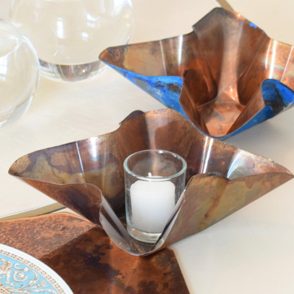 From Terri Dallriva in Clinton, MS comes this copper piece. Made to hold a single votive candle and glass holder, this piece comes in a classic patina finish, blue, or verdi (green) finish- designed to enhance and compliment any décor. Includes votive candle and glass holder. Comes with glass holder and votive candle.