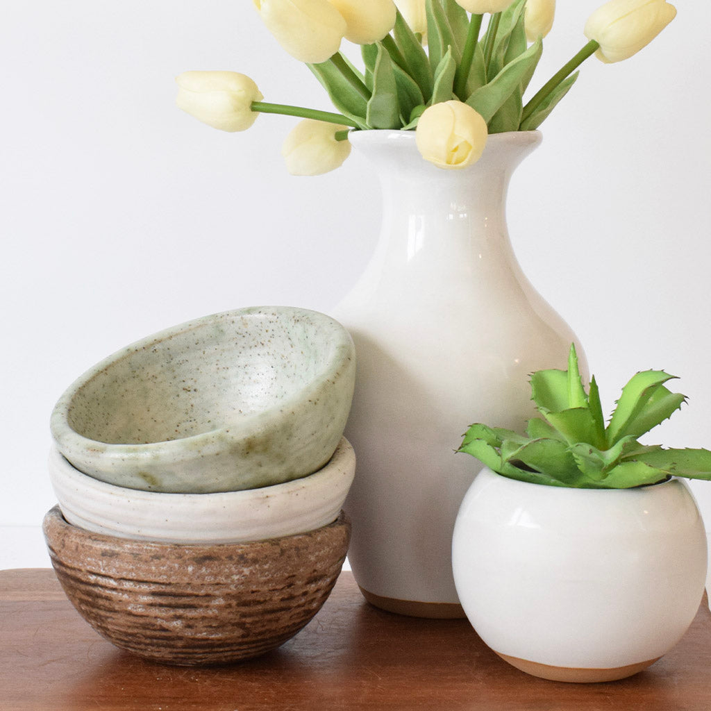 The rich earth tones of the Mississippi Delta are captured in the glazes and textures of this pottery, crafted with care by the Woods Brothers of Mound Bayou, MS. This piece measures 5 inches x 2 inches .