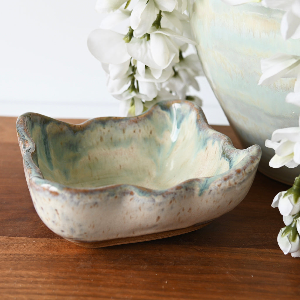 Each unique piece of Etta B Pottery is handcrafted and meticulously hand painted. The beautiful glazes provide a color palate sure to coordinate with any decor. The distressed and antique accents on these exquisite textures makes each piece a treasure. Though similar, no two pieces are just alike.