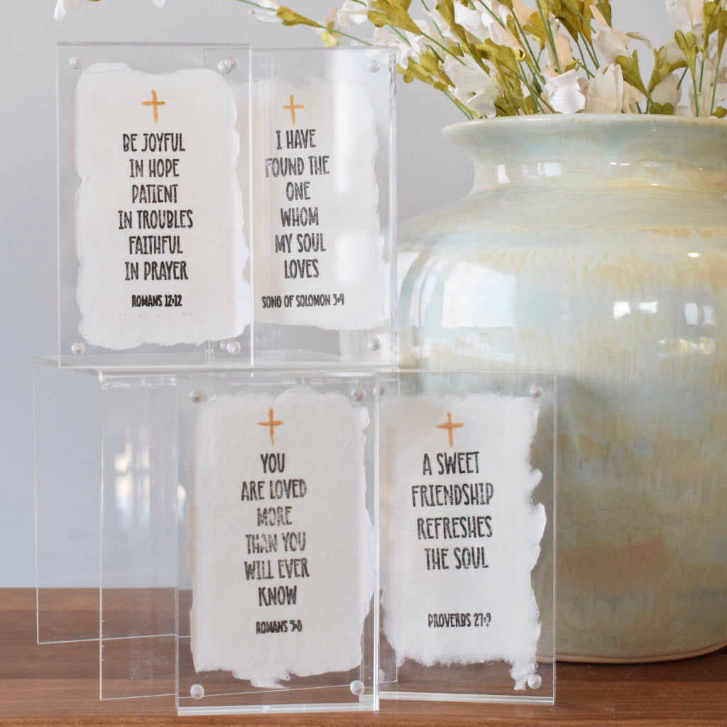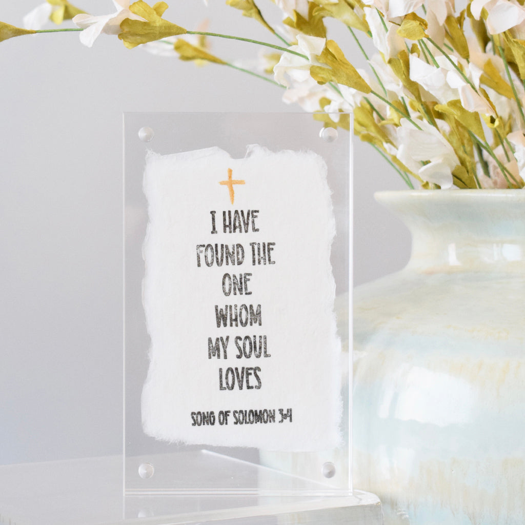 The Song of Solomon 3:4 Acrylic Block is an inspirational and unique gift. Crafted from sturdy acrylic, the block measures 3x5, making it the perfect size for windowsills and desks. This meaningful gift will remind your loved one of the love of God throughout the day.