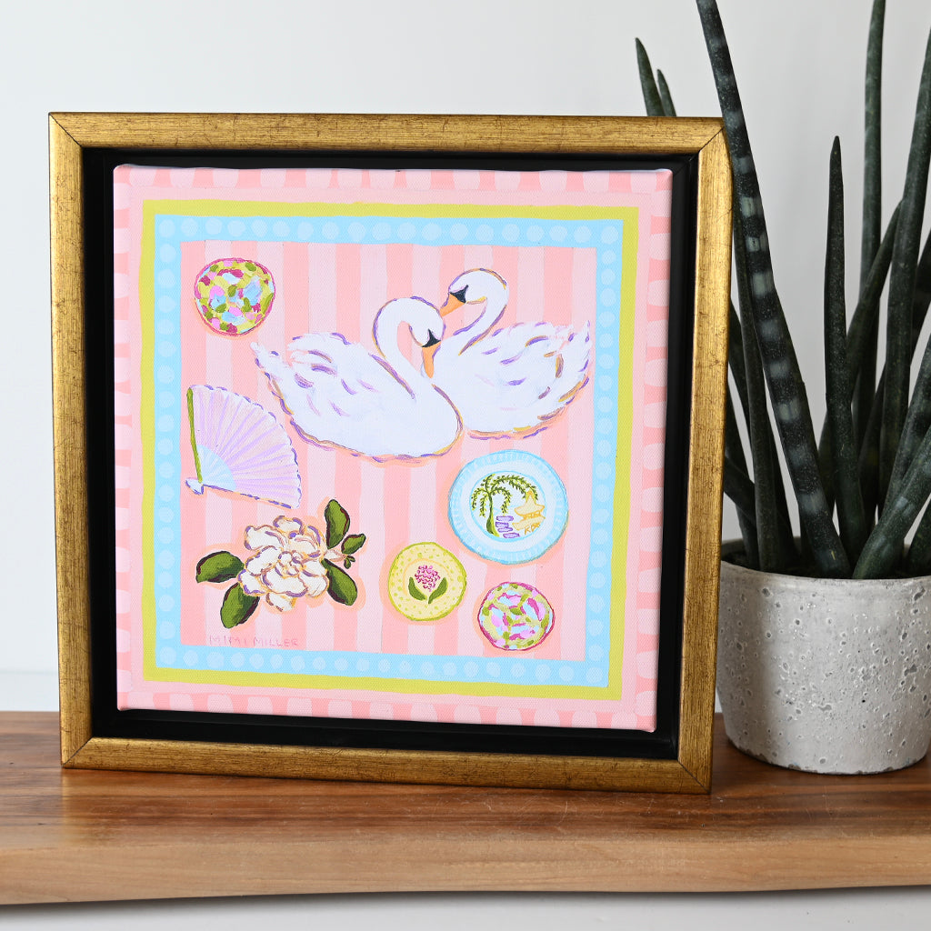 This 12" x 12" canvas print by artist Mimi Miller showcases a graceful pair of swans, elegantly captured to bring a serene touch to any space. Presented in a sleek floating frame, it arrives ready to hang, combining artistic beauty with effortless installation. Ideal for enhancing your home or office with refined, nature-inspired decor.
