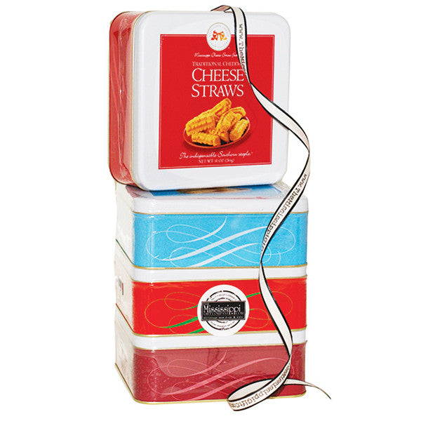 A great way to say thanks for a job well done! Big enough for a medium to large office, this cheese straw tower contains four 10 oz tins of our favorite and best selling straws: