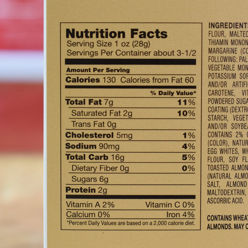 Ingredients: Flour, Margarine, Artificial Flavor, Citric Acid, Beta Carotene, Vitamin A, Powdered Sugar, Egg Whites, Whey, Milk, Rice Flour, Wheat Flour, Butter, Toasted Almonds, Natural Almond Extract, Salt, Almond Powder, Ascorbic Acid.