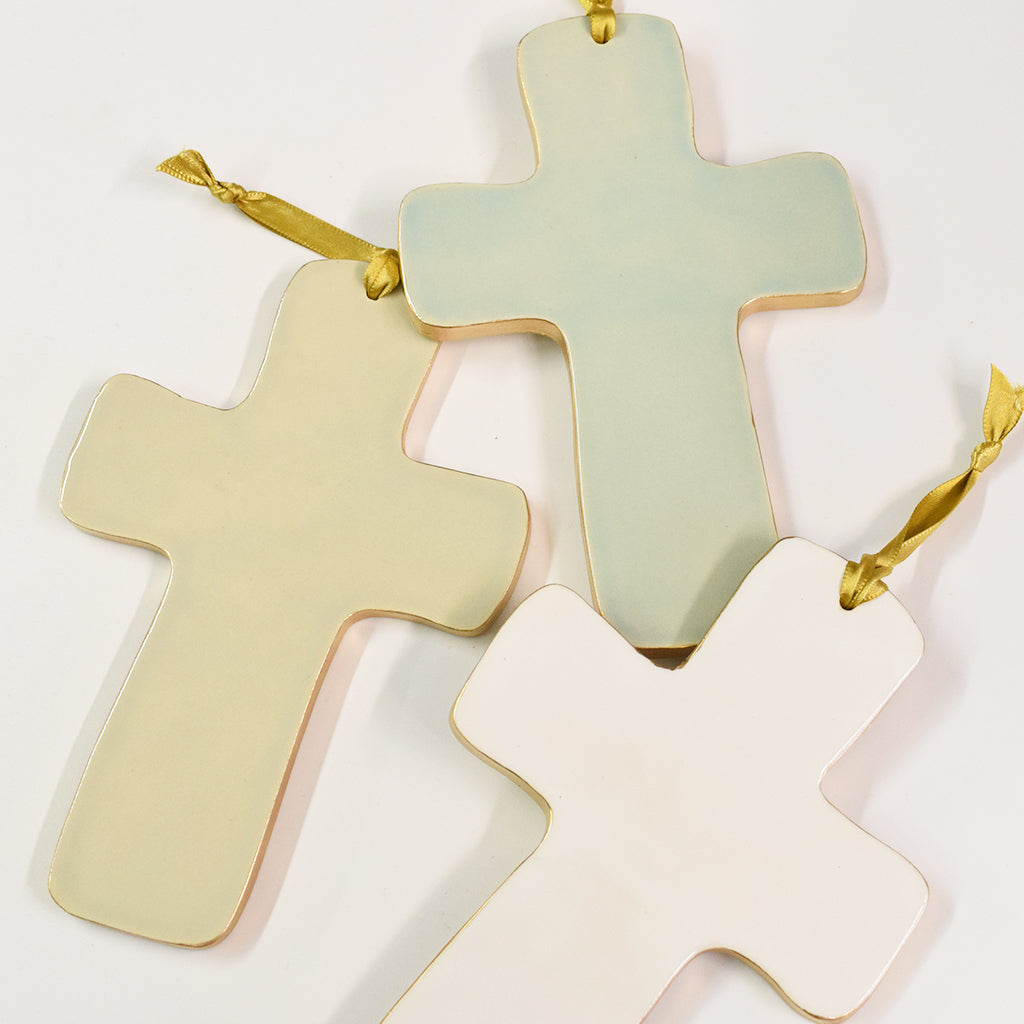 Hang this beautiful cross on your wall, place it on a coffee table, or shelf as a great addition to your home decor. The glossy light gray glaze & gold edges give such a classic look to this piece.