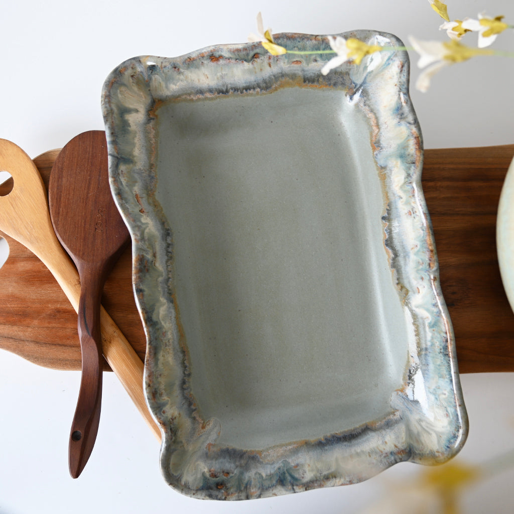 Spice up your dinner parties with this beautiful Wavy Rectangle Baker in Peaceful! The eye-catching design is perfect for setting the table and entertaining guests. Oven and Dishwasher safe, this dish will be convenient at your next gathering!