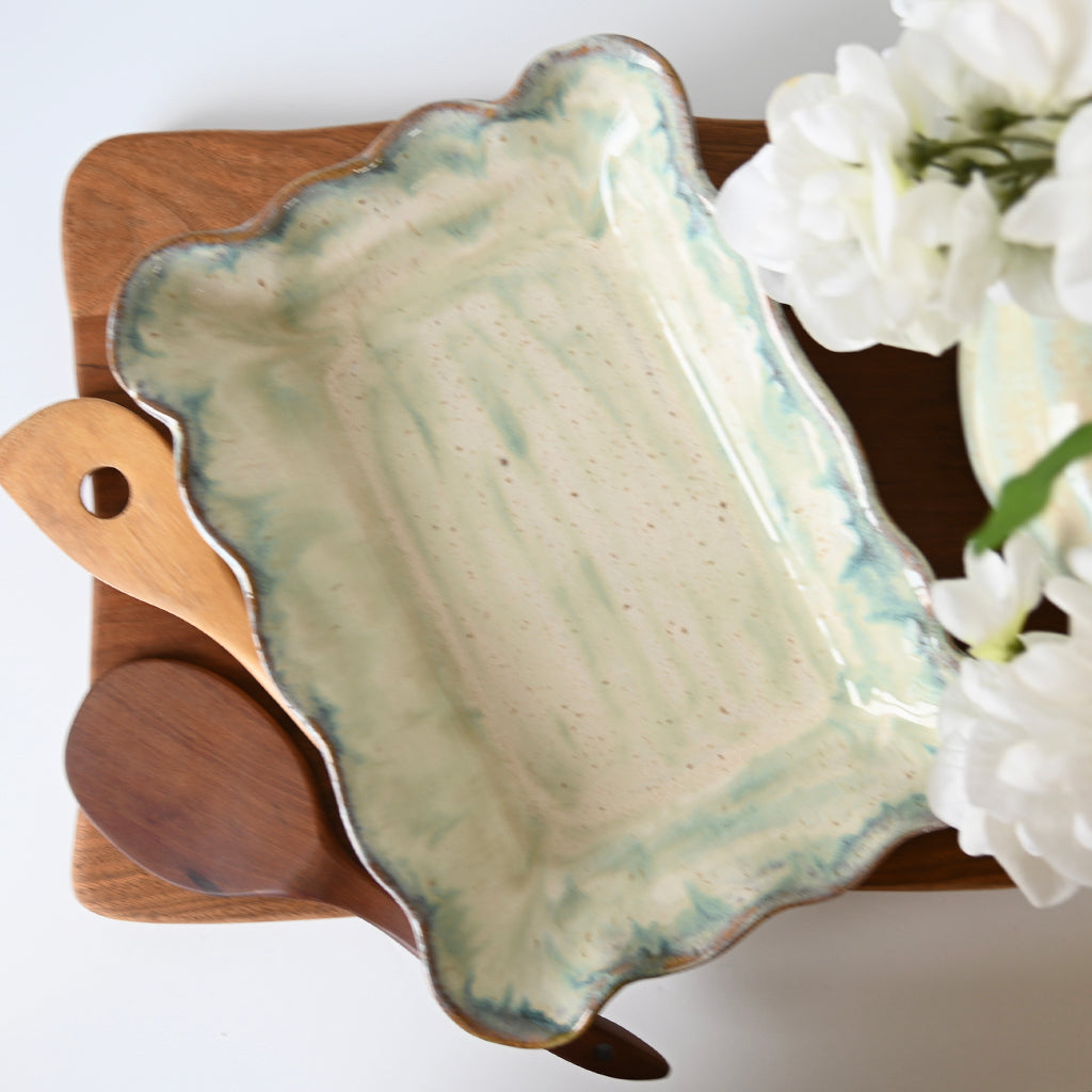 Spice up your dinner parties with this beautiful Wavy Rectangle Baker in Seaside! The eye-catching design is perfect for setting the table and entertaining guests. Oven and Dishwasher safe, this dish will be convenient at your next gathering!